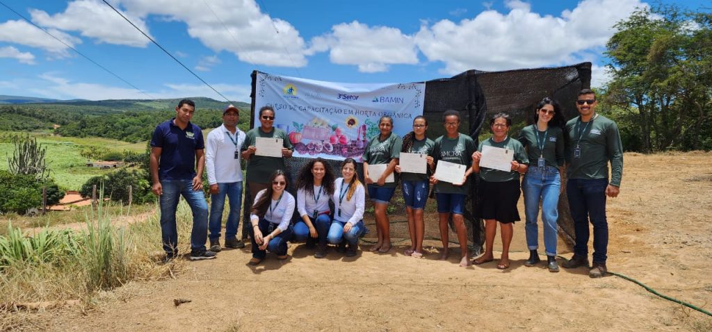 Na manhã do dia 11 de fevereiro, a 3º Setor, através do Projeto Transformar da BAMIN, em parceria com a AMCRA (Associação das Mulheres da Comunidade de Rio das Antas), promoveu uma Capacitação em Horta Orgânica na Comunidade de Rio das Antas, localizada em Brejinho das Ametistas. Previamente à realização do curso, foi construída uma estufa para o cultivo das hortaliças e um sistema simples de irrigação. No decorrer da capacitação foi realizado o plantio de mudas e sementes pelas mulheres da AMCRA e explanado sobre o perigo do uso de agrotóxicos, relevância da alimentação orgânica, produção agroecológica sustentável, produção de biofertilizantes, reciclagem de nutrientes no solo, trabalho em cooperativismo e sistema de mutirão.
